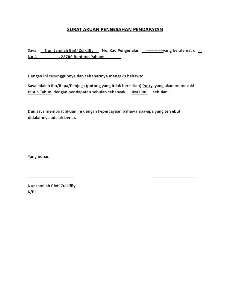 Saya ismail bin mohamad no. Surat akuan pengesahan pendapatan tersebut adalah merupakan dokumen pengganti kepada penyata pendapatan pekerjaan mereka.